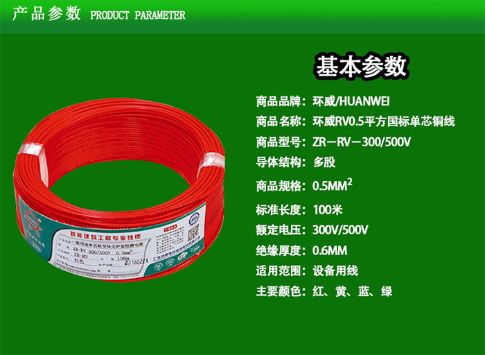 环威BV0.5平方国标单芯铜线